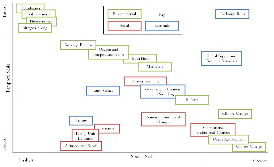 Components and processes occur at differing rates in comparison to others. Generally, smaller components at smaller scales act faster and change more frequently than larger components at greater scales (Gunderson, 2002). However there are exceptions. Societal attitudes in individual households can change at a much slower pace than in governmental institutions and global currency values can fluctuate faster than national interest rates. All scales should be evaluated as it is the cross scale interactions that can dramatically influence the system dynamics. If they can be identified than management practises can be altered or introduced to limit the potential damage that any interaction could do and is critical for any systems long-term resilience.