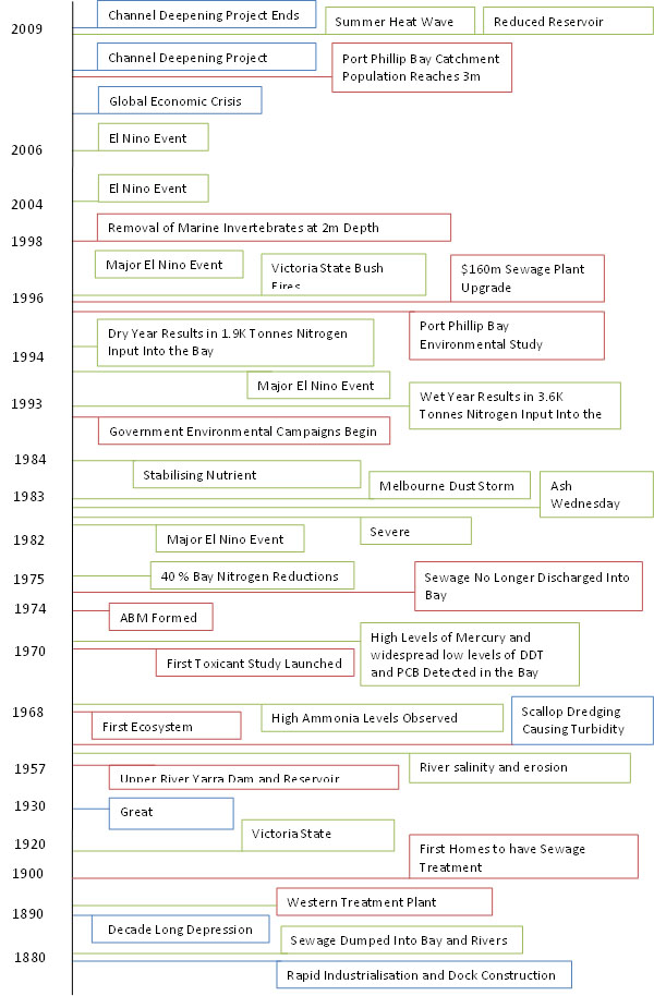 Using an historic timeline approach, we can assess the changes that have occurred to the system and the causes. Indicators of system response can then be identified and allows mangers to react appropriately to similar events. This is particular of events at scales that cannot be monitored or actively managed. Port Phillip Bay’s timeline includes social, economic and environmental events from 1890 to 2009 (Figure 19).