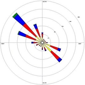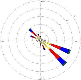 Sediment flux requires an active wind. The dominant wind directions are the North West (NW) and South East (SE). Wind does though blow in all directions throughout the year. The strength and occurrence rates of the winds vary through the seasons (National Weather and Climate Center, 2003). In August the winds blow with almost equal intensity from the NW and SE. From August to March the winds blows for the most part from the SE (Fig 3). By April this has reversed and until August remains dominant (Fig 4). Wind therefore is mainly bi-directional and subjects the dunes to wind processes from the SE for one half of the year, and the opposite direction, the other half.