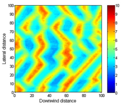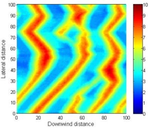 If we increase the iterations to 1000 we see longer and less sinuous dunes forming (Fig 7). This can be assumed to be what would happen to the Bruneau dunes, if one of the prevailing winds were to cease. If for example the wind regime were to change and for the overwhelming majority of the time wind only blew from the NW then we may get a dunes migrating and merging producing increasingly less sinuous.